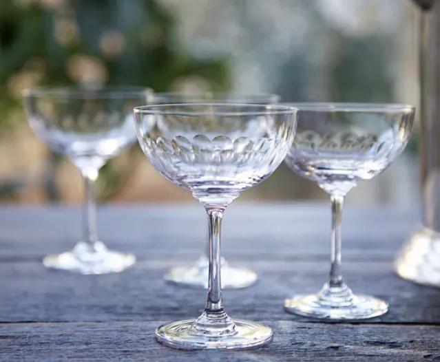 Champagneskålene fra The Vintage List er pakket i gaveesker à seks glass. De kan også kjøpes enkeltvis. Hvert glass er håndblåst og håndgravert. Glassene er laget av blyfri krystall.
