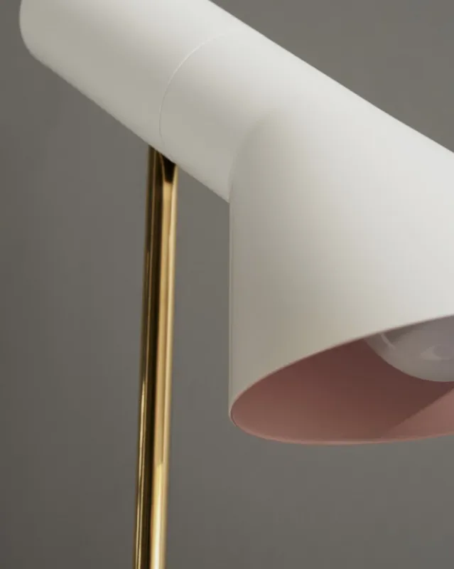Spunnet stål, hvit våtmalt utside og blekrosa pulverlakkert innside. Sokkel i formstøpt stål, hvit våtlakkert. Stamme: Polert messing, ubehandlet. Svitsj: På lampesokkelen. Ledning: 2,4 m. hvitt stoff med hvit plugg.