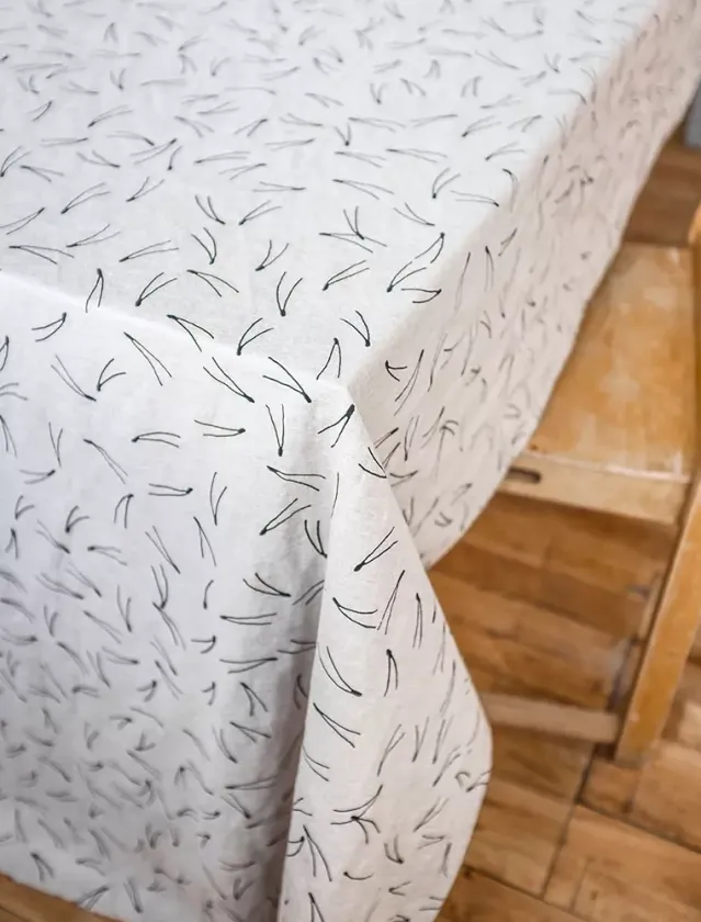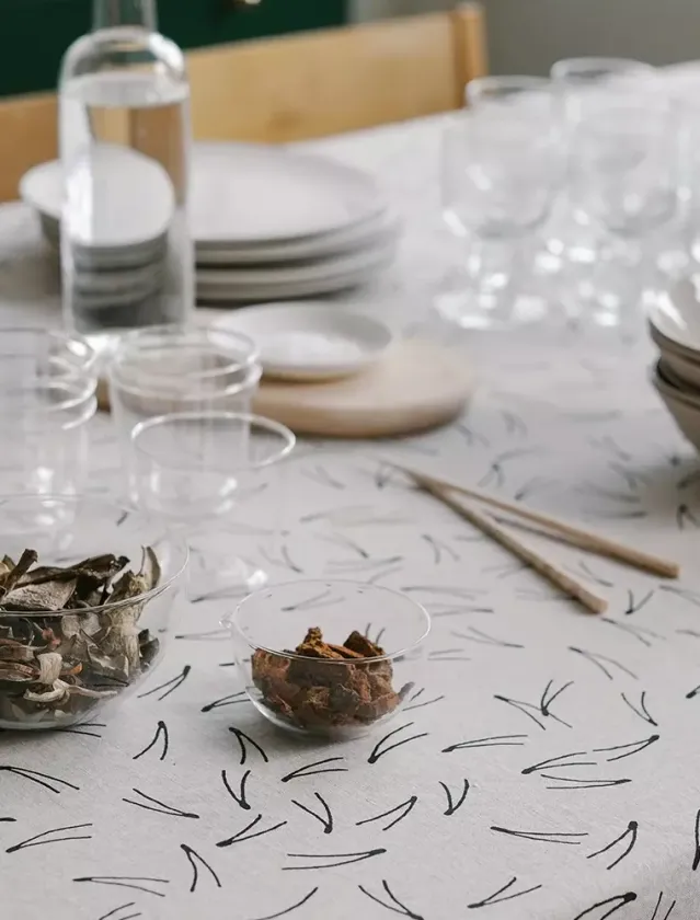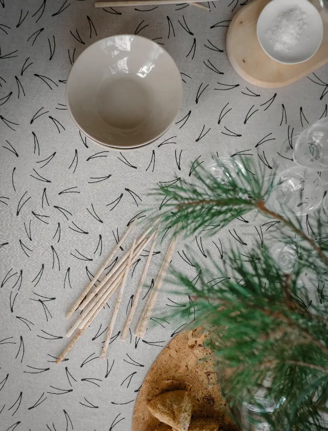 Fine Little Days klassiske mønster Barr på lerret i herlig vasket ubleket linkvalitet. En stor del av Fine Lille Days mønsterverden er inspirert av uttrykk fra svensk natur. Barr-mønsteret ble trykt på tekstil for første gang i 2013.
