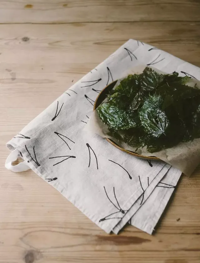 Kjøkkenhåndkle med nålemønster i vasket ubleket linkvalitet.