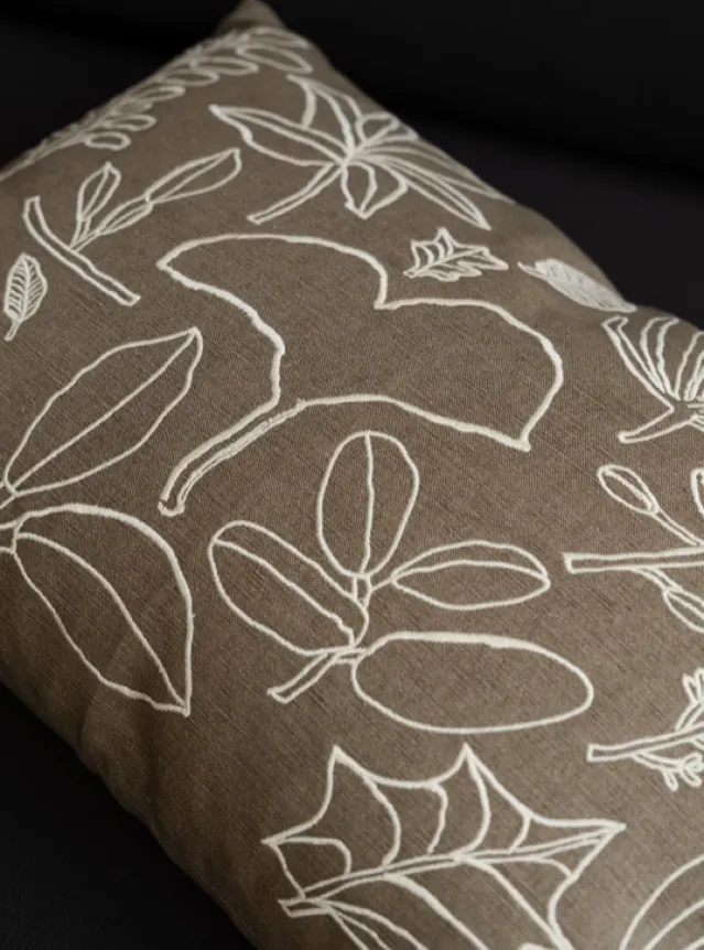 Materiale 70% lin, 30% bomull, 185 gsm. Broderi med polyestertråd.
