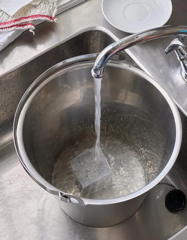 Eller; Legg den i vasken, la vannet varmt renne over til det skummer litt, tan den opp igjen. Vask opp som vanlig