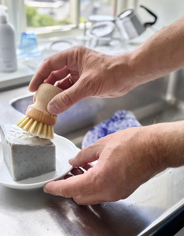 Legg såpestykket i bunnen av an bøtte, la vannet renne over til du har fått litt såpe i vannet. Fjern såpen – og angrip hybelkaninene. Kan brukes på kjøkkenbenker av sten, marmor, laminat eller tre – men også på flisgulv, kjøkkenbord, gulvvasken og støvtørking