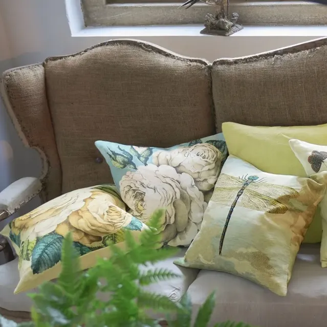Alle våre puter kommer med en luksuriøs fjærpute.»>Denne fantastiske puten har en dristig detaljert øyenstikker satt på en vintage gravering av en eterisk himmel. Digitalt trykt på rent lin med delikate broderte knutedetaljer og en trykt himmelrevers.