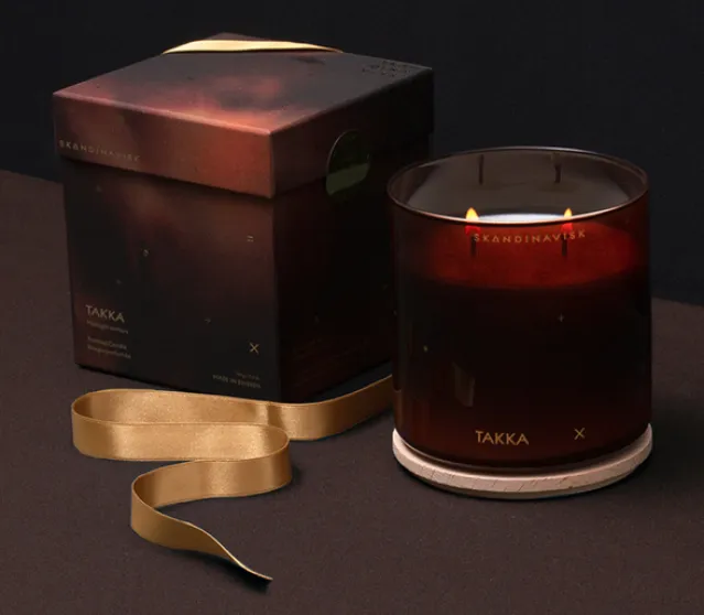 Duftlyset TAKKA med duftnoter av opphakket furu, ull, tobakk og røyk fra høystabler.