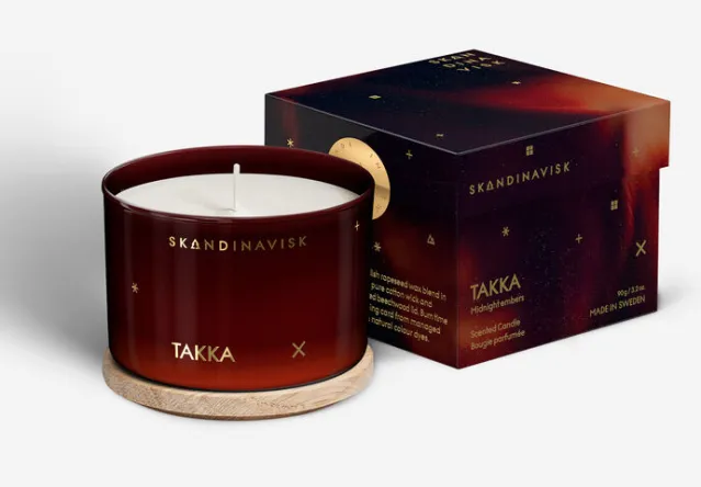 Duftlyset TAKKA med duftnoter av opphakket furu, ull, tobakk og røyk fra høystabler.