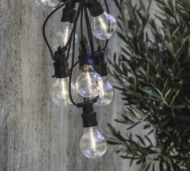 Sort lyslenke med 10 faste, ikke utskiftbare, lamper i klart plastglass (PET). Lampene gir en varmhvit glød, 2700K. 40 lumen. Lampeholderne har en liten krok på toppen som du kan bruke til å henge opp i for eksempel et tau. Lysstrengen er 8,7m lang og det er 4m til den første lampen, deretter 0,5m mellom hver og en liten kort hale ved den siste lampen. IP44 for innendørs eller utendørs bruk. Denne lavspentslyngen har en rund tynnere kabel og transformator. Total lengde er 8,7m. Det er ikke mulig å bygge på flere løkker.