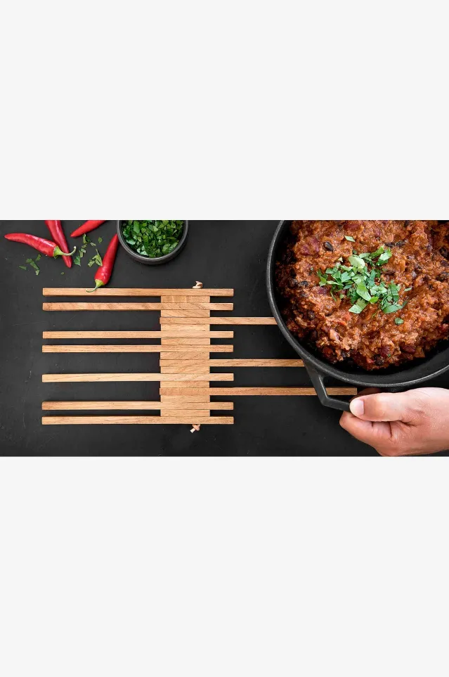 Table frame er et smart underlag av eik som felles ut og kan brukes til både små og store gryter og fat.