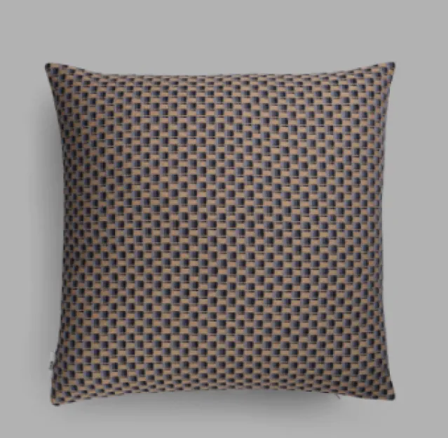 Designeren har prøvd å oversette dette flettede uttrykket fra en konstruktiv tekstiloverflate til et lett, mykt og dekorativt pledd med tilhørende puter !