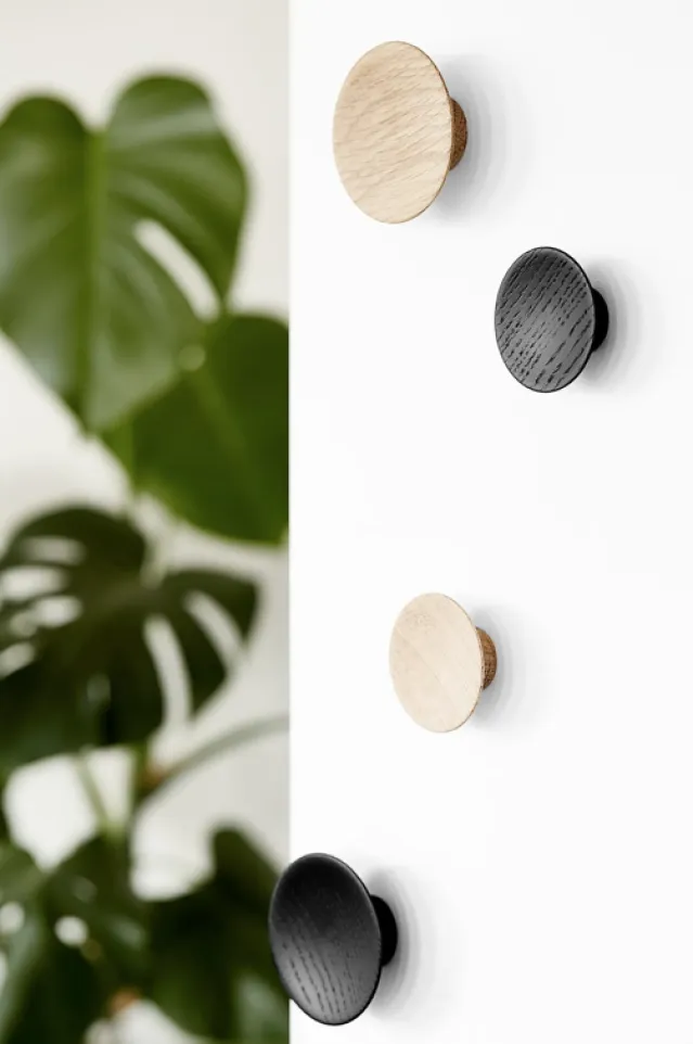 Olympia er laget av massiv eik og kan brukes både som krok på veggen og som grep på skuffer og dører. Olympia finnes i både natur- og sortmalt eik i to ulike størrelser som kan blandes slik at du kan skape ditt helt eget uttrykk i innredningen.