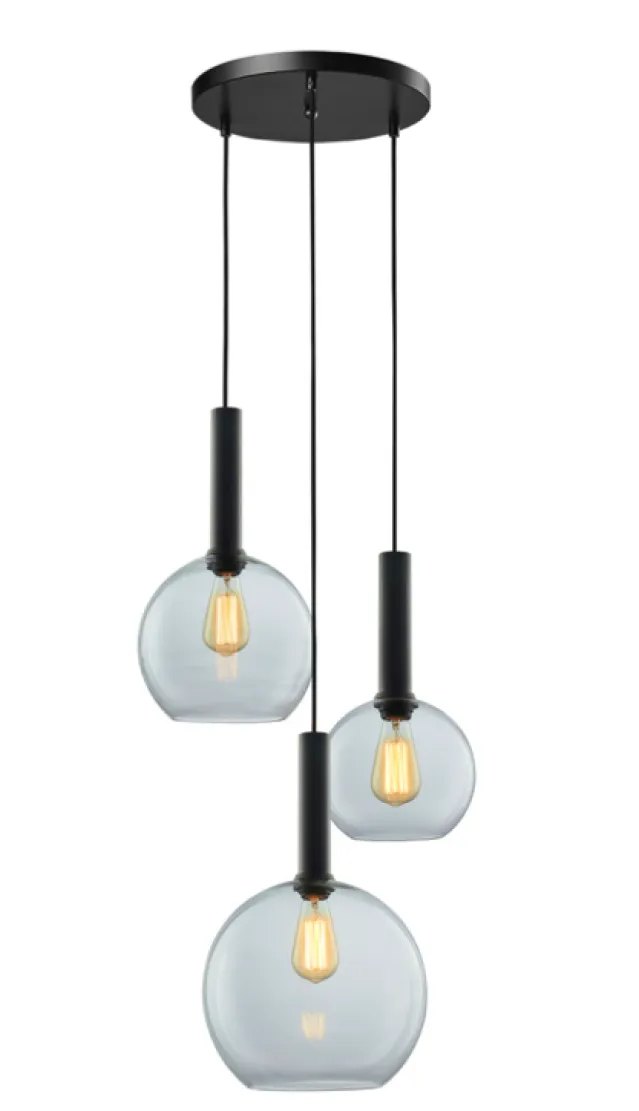 -Lampen består av 3 klare glasskuppler -2 x Ø25 og 1x Ø30 cm, sort oppheng med pæresokkel i metall og 3 m tekstil-ledning og sort takbaldakin med tre hull.