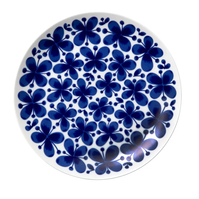 Den koboltblå Mon Amie-tallerkenen (27 cm) er et nostalgisk valg for middagsbord. Skissen av en labrador-teblomst fra 1940-tallet av Marianne Westman illustrerer moderne former. Det vakre mønsteret spirer gjennom platen og gir illustrasjonen full blomst. Den nesten kantløse tallerkenen er moderne og praktisk også som serveringsfat.