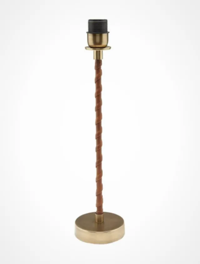 Lampefot Nora laget av metall i antikk messing med kunstskinn viklet rundt rammen. Vakkert enkelt og klassisk design. Sort tekstilledning 160cm med bryter. Høyde 46 cm. E27 stikkontakt. Maks 40W. IP20. Passer en skjerm på ca 20cm i diameter. Lyskilde ikke inkludert.