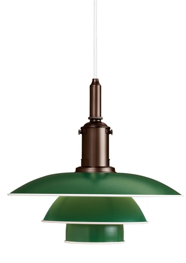 PH 3½-3 pendel er utført med metallskjermer i fargene grønn, sennepsgul, rød og hvit. Alle med hvite rullekanter. Opphenget er silkematt brunt og utført i kobber. Skjermholderen og skruene er fremstilt i kobberbelagt messing for å sikre nødvendig styrke. Leveres med E27-sokkel, som kan brukes med både LED-pærer, sparepærer og halogenlyskilder. Maks. 100 W.