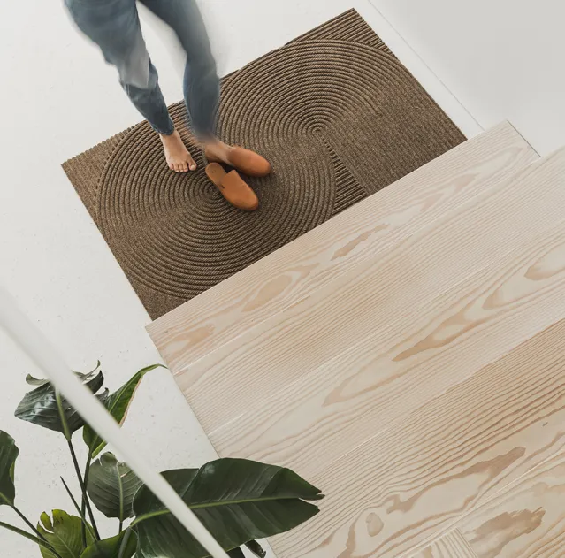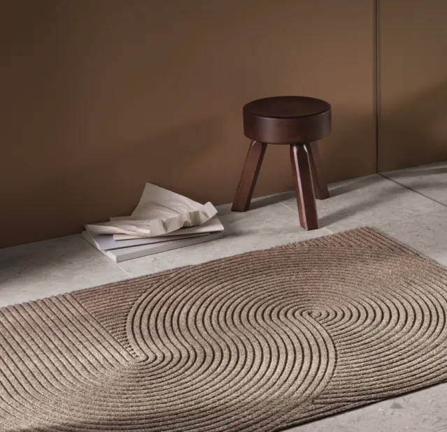Sand er inspirert av japanske zen-hager, og kommer i en rolig beigetone som bygger nydelig opp under navnet på matten. Det tredimensjonale mønsteret er sanselig og meditativt, og skaper ro og tilstedeværelse idet man passerer dørstokken.