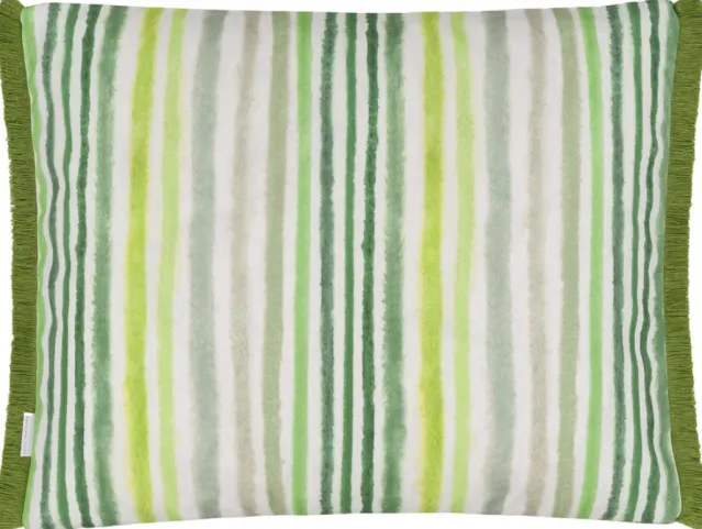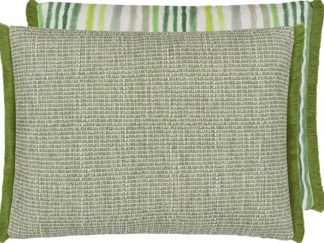 Denne store rektangulære innendørs/utendørs puten har en allsidig dobbel tonet jacquardvevning kombinert med et trykt lerret laget for utendørs bruk, men også utrolig praktisk for innsiden! Pompano-vev i grønt på fremsiden og Palasari utendørstrykk i mose på baksiden. Avsluttet med en børstet frynsekant i knallgrønt laget for utendørs bruk.
