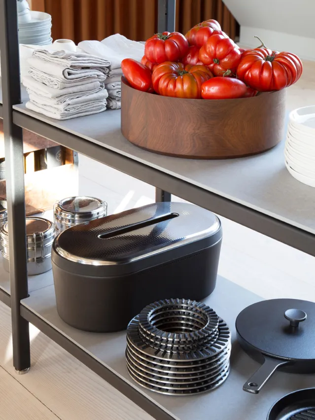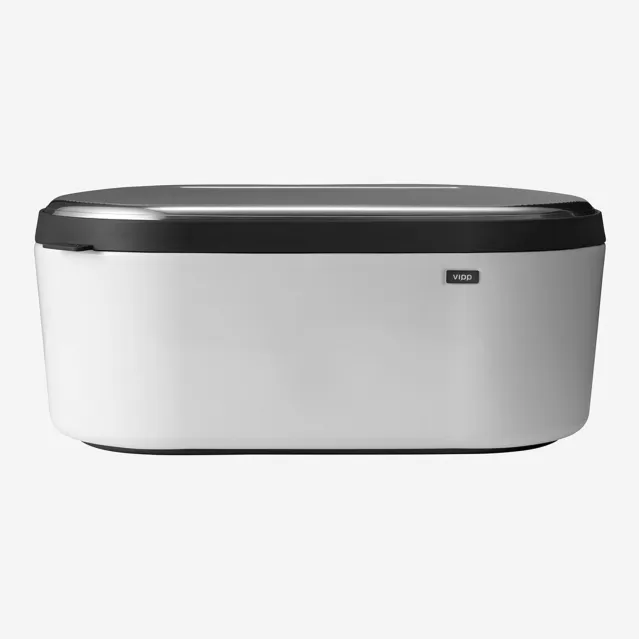 Vipp brødboks er et robust alternativ for oppbevaring av brød på kjøkkenet. Vipp brødboks består av et rengjøringsvennlig stållokk, et romslig volum og en vaskbar innerpose. En gummiring på bunnen beskytter overflater.