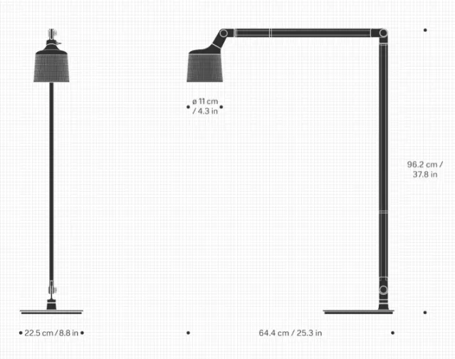 Vipp gulv leselampe er en leselampe for stuen. Gulv leselampen er utstyrt med detaljer som en justerbar arm for å fokusere lyset, samt en perforert skjerm og matt glass for en behagelig lysspredning.