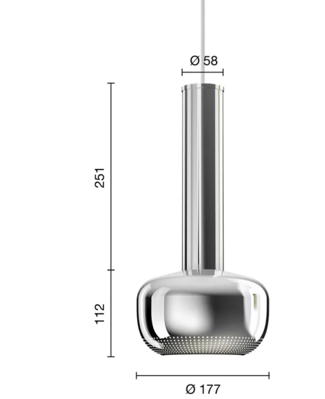 Polert forkrommet aluminium i skjerm, rør og lokk. Kalesjen er inkludert og 4 m. hvit tekstilsnor.E27