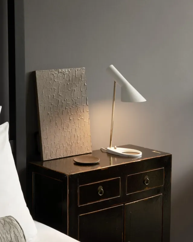 Spunnet stål, hvit våtmalt utside og blekrosa pulverlakkert innside. Sokkel i formstøpt stål, hvit våtlakkert. Stamme: Polert messing, ubehandlet. Svitsj: På lampesokkelen. Ledning: 2,4 m. hvitt stoff med hvit plugg.