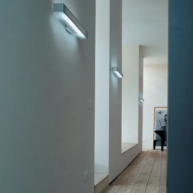 Innendørs eller utendørs vegglampe som gir direkte/indirekte belysning. Opalin polykarbonat deksel. Bøyde ståldeksler. Deksel i rustfritt stål med sateng finish. Opalin polykarbonat veggfeste. Presset og galvanisert plateballaststøtte.