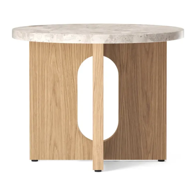 Androgyne sidebord fra Menu er et rundt lite bord som kombinerer to klassiske former for å skape en vakker kontrast. Den runde bordplaten i lys marmor står plassert på den rektangulære basen i eik, noe som skaper et spennende møte mellom myke og harde linjer. Det indre tomrommet mellom bordbena danner en vakker silhuett. Sidebordet blir perfekt ved siden av sofaen eller favorittlenestolen din !