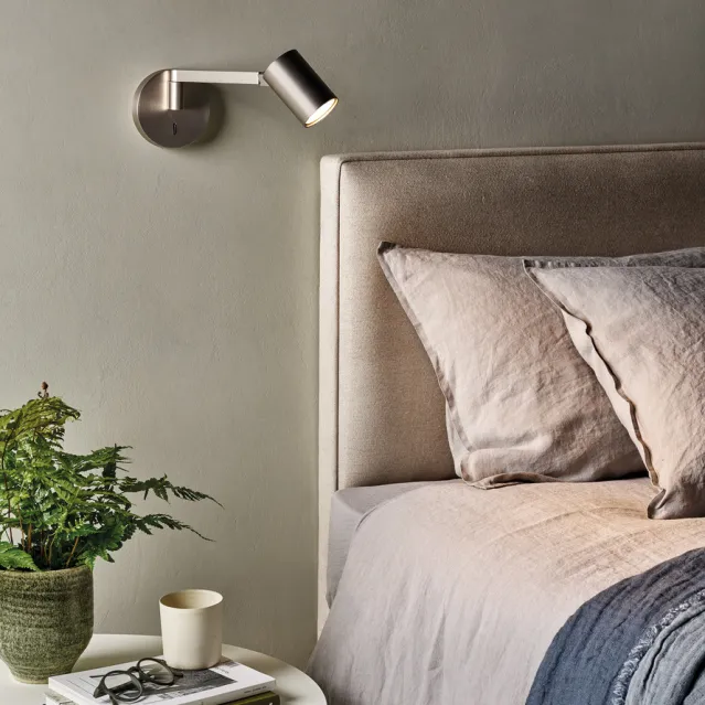 Flott vegghengt leselampe i metall med svingbar arm og justerbart hode. Perfekt over sengen.