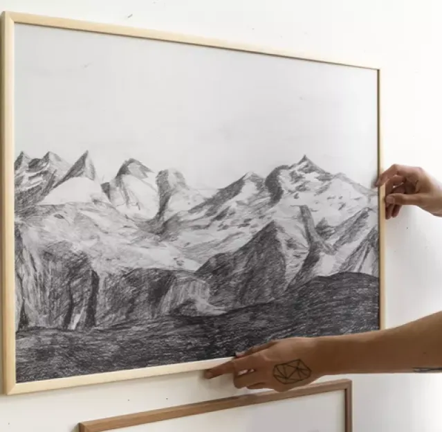Flott plakat med et landskap av fjell tegnet med blyant !