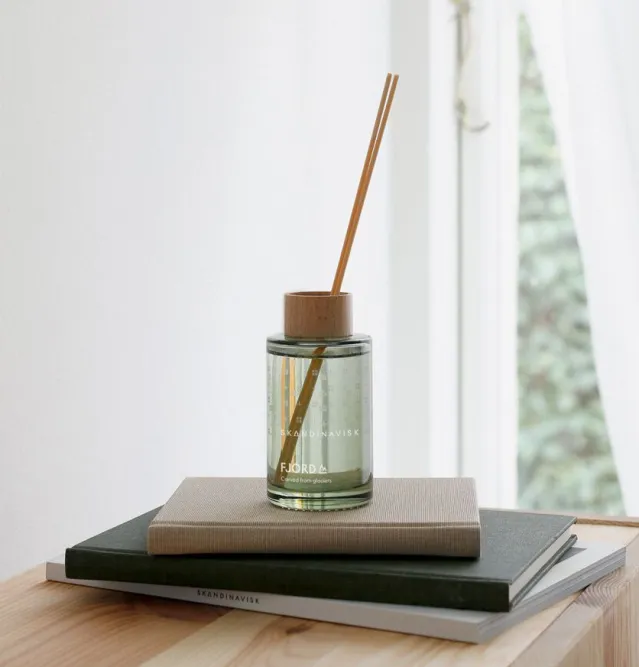 Skandinavisk diffuser-kolleksjonen blander skandinaviske dufthistorier med fornybart dyrkede vegetabilske oljer inne i en malt glassvase, med dekorativ FSC-sertifisert bøketrering og åtte høyytelses siv for en mild og ansvarlig romduft. Alkohol fri. Ufarlig. Vegansk.