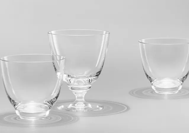 Flow glassene er inspirert av rennende vann. Designet spiller også på effekten av ringer i vann (kommer godt frem på det ene vedlagte bildet)