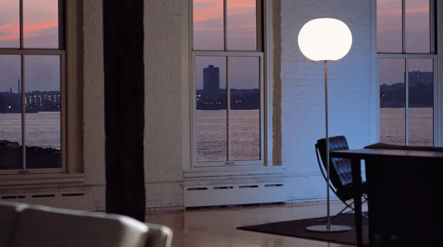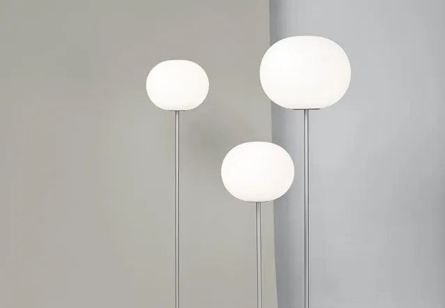 Mål: Ø 45 cm (skjerm), H 185 cm, Ø 40 cm (fot).