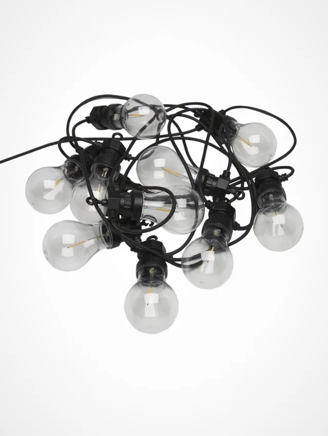 Sort lyslenke med 10 faste, ikke utskiftbare, lamper i klart plastglass (PET). Lampene gir en varmhvit glød, 2700K. 40 lumen. Lampeholderne har en liten krok på toppen som du kan bruke til å henge opp i for eksempel et tau. Lysstrengen er 8,7m lang og det er 4m til den første lampen, deretter 0,5m mellom hver og en liten kort hale ved den siste lampen. IP44 for innendørs eller utendørs bruk. Denne lavspentslyngen har en rund tynnere kabel og transformator. Total lengde er 8,7m. Det er ikke mulig å bygge på flere løkker.
