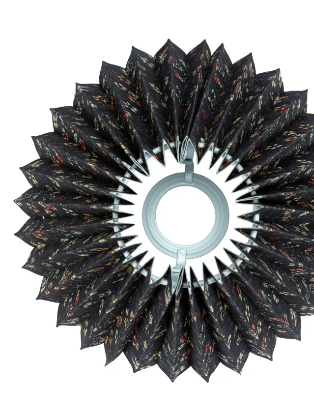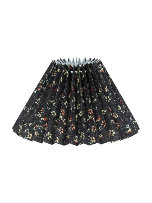 Ines plisserte lampeskjerm med ett småblomstrete mønstret stoff på mørk bunn. Formen er lett skrånende og har en hvit inside som gir et fint skinn når lampen er tent. Det blomstrete stoffet er laget av 100% økologisk bomull.