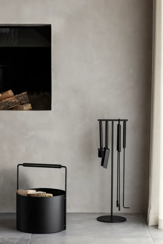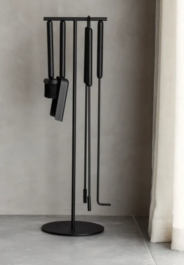 Peissett i pulverlakkert stål – med sortbeiset eik på håndtakene. Disse har igjen en magnet som gjør at hver av redskapene henger godt fast på stativet
