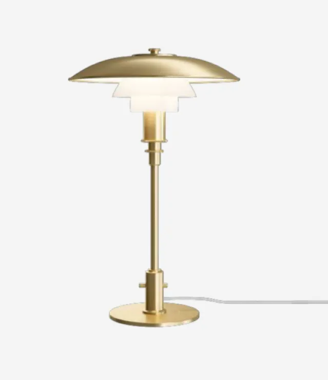 Varme messingtoner kan bringes inn i moderne miljøer med den allsidige og visuelt slående bordlampen PH 3/2, som er laget av opalt glass og messing. Toppskjermen i messing har en hvitmalt innvendig reflektorskjerm for en jevn og behagelig nedoverrettet belysning. De to glassskjermene er laget av munnblåst opalt trelagsglass, som er blank på toppen og sandblåst matt på undersiden, noe som gir en myk og jevn lysfordeling. Forvent og sett pris på variasjonene av fargetoner og små bobler i glasset. Messingen er ubestrøket og har fine hårlinjer som følger formen. Det vil utvikle patina over tid. Kan poleres. PH-initialer diskret gravert på stikkontaktholderen (bak den nedre glassskjermen).