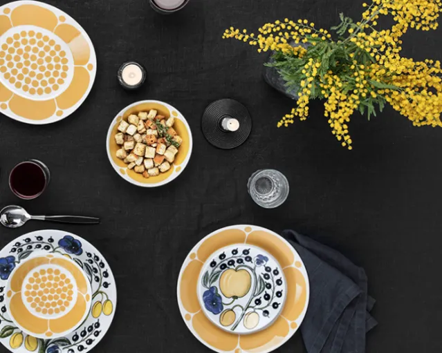 Sunnuntai-mønsteret designet av Birger Kaipiainen i 1971 er fylt med positivitet, akkurat som en solfylt søndag. Den forteller historien om sin tid og dekorerer de samme formene som Arabias ikoniske Paratiisi. Den gule fargen bringer litt av den søndagsfølelsen til hver dag.