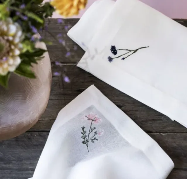Blomsterservietten er en del av kolleksjonen FLORA som er inspirert av den skandinaviske sommer med lange lyse netter. Her finnes de mest kjente og elskede sommerblomster. De vokser vilt og helt av seg selv i naturen. Nyt de vakre broderiene av florlett blomstrende gulrot, kornblomst, klokkeblomst, løvetann, valmue og lupin på duker, bordløpere og servietter.»