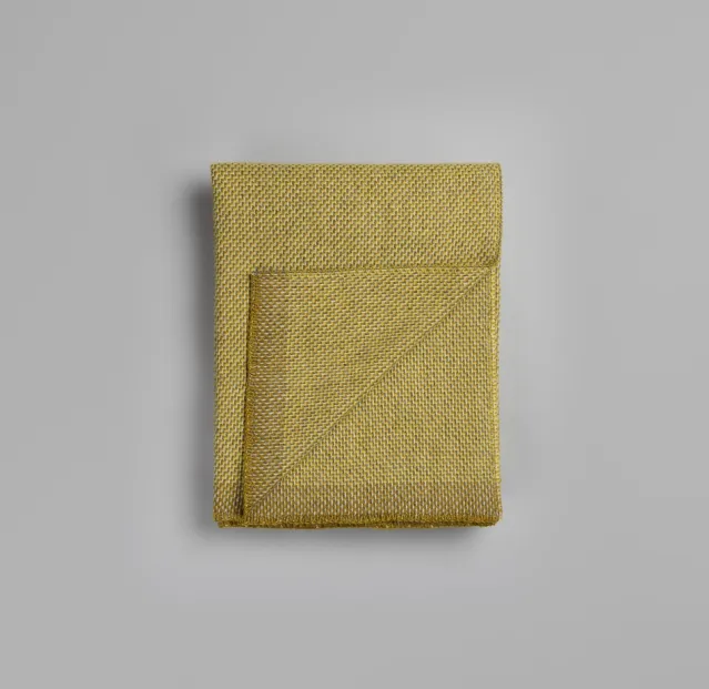 Pleddet Una er bygget opp som flettede bånd. Kulørte treklanger er krysset med graderte gråtoner. I endene på pleddet er fargene fortettet i en dekorativ prydsøm.