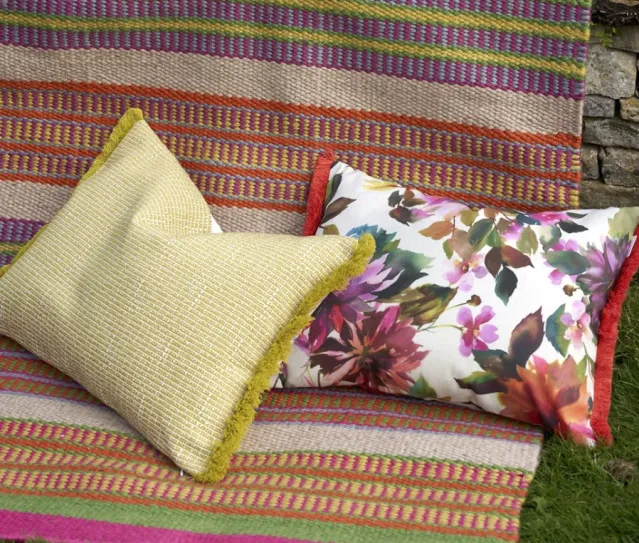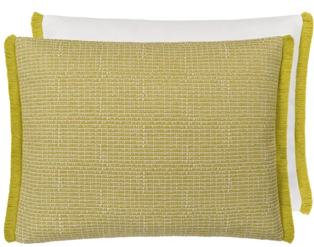 Denne store rektangulære innendørs/utendørs puten har en allsidig dobbel tonet jacquardvev kombinert med et vanlig lerret laget for utendørs bruk, men også utrolig praktisk for innsiden! Pompano-vev i akasie på fremsiden og Lovina utendørs i kritt på baksiden. Avsluttet med en børstet frynser i mose laget for utendørs bruk.