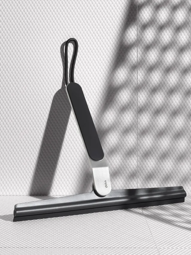 Vipp dusjnal har et utskiftbart skrapeblad i som enkelt fjerner vann fra jevne overflater på badet. Myke kanter beskytter overflater, og gummistroppen gjør det enkelt å henge dusjnalen på den medfølgende kroken etter bruk.