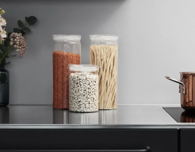 Vipp glassbeholder er en praktisk oppbevaringsløsning til kjøkkenet. Denne beholder fås også i en større utgave og er fremstilt av holdbart borosilikatglass med en transparent gummiring som sikrer at lokket er helt tett.